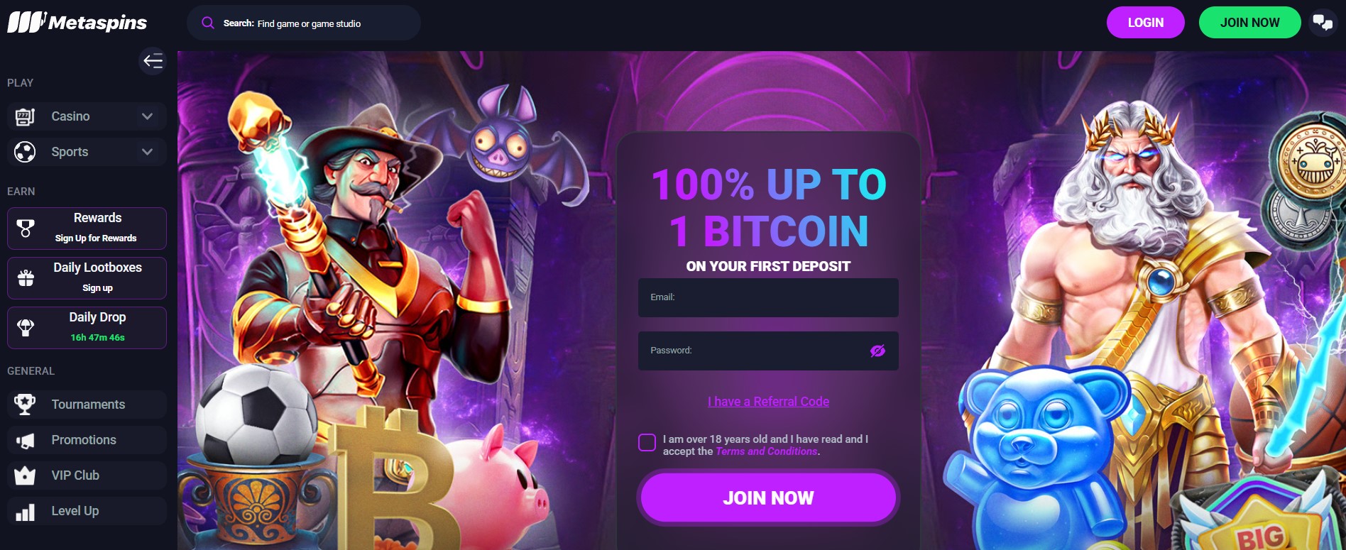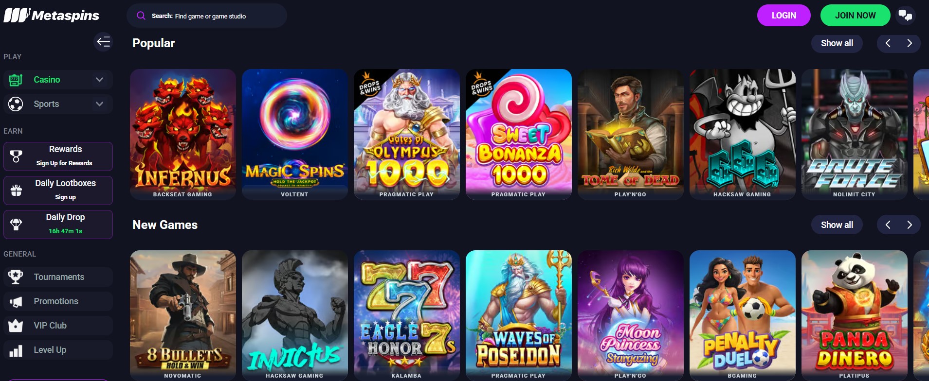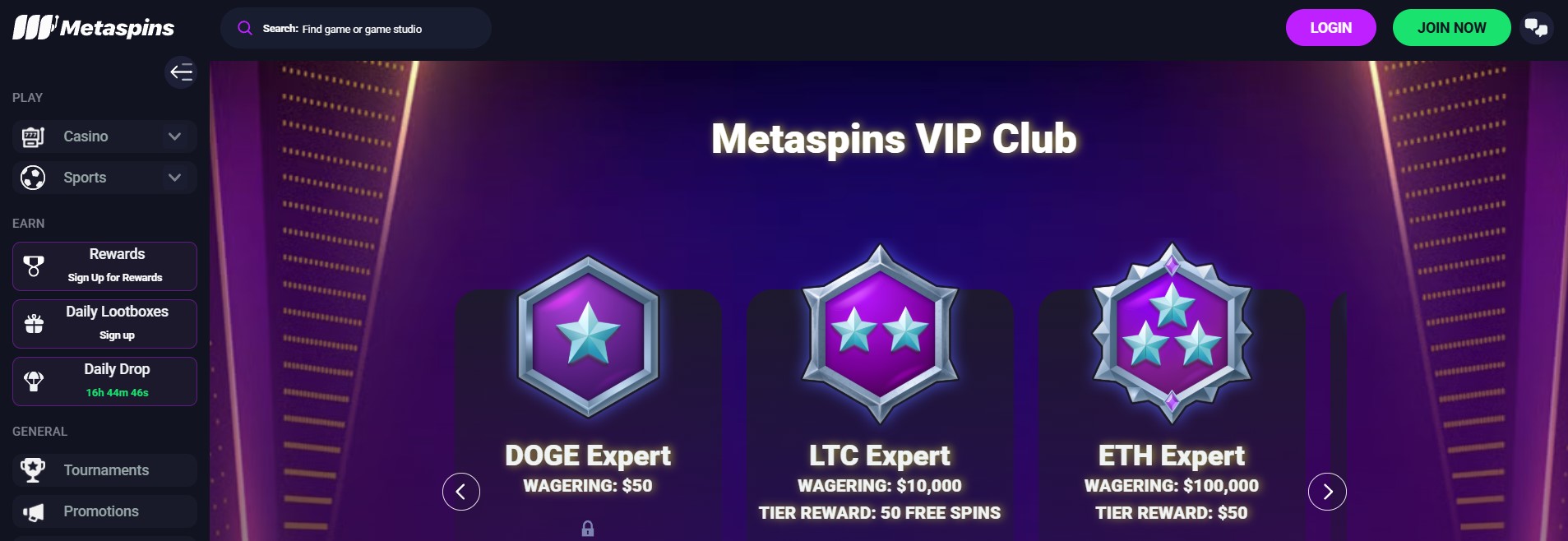 Metaspins har et nivåbasert Level‑Up-system med lootboxes, daglige drops og doble Level‑Up-poeng via “Game of the Week”.