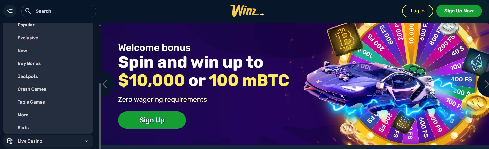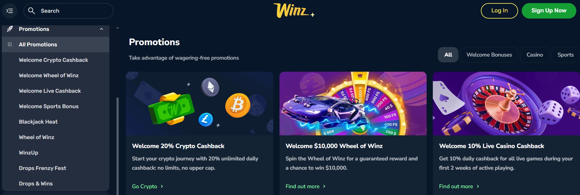 Winz tilbyr en unik velkomstbonus kalt "Welcome Wheel of Winz", hvor nye spillere får én snurr på lykkehjulet – uten omsetningskrav. Avhengig av innskudd får du: