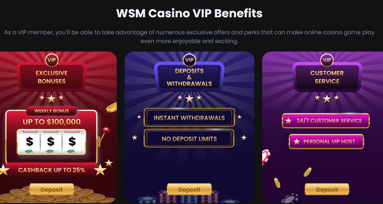 Lojale spillere får jevnlige reload-bonuser, cashback og deltakelse i ukentlige turneringer. I tillegg har VIP-medlemmer tilgang til eksklusive kampanjer, kontomanager og raskere WSM uttak. Din WSM casino bonus vises i brukerens profil og via nyhetsbrev.